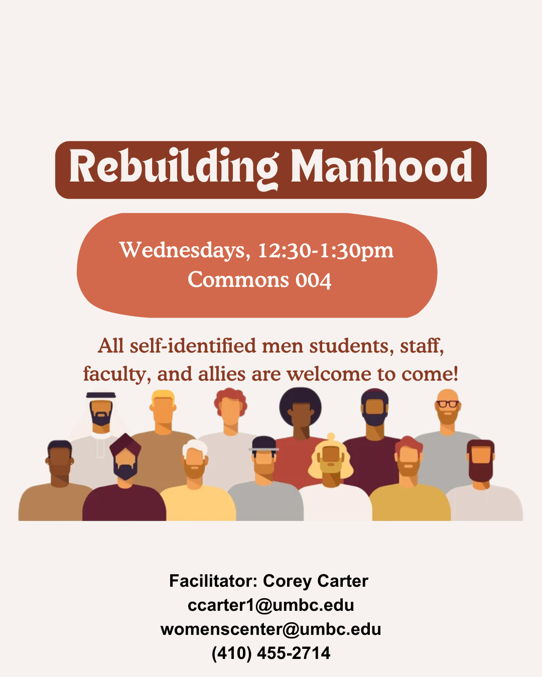 Rebuilding Manhood is a weekly discussion group for self-identified men students, staff, faculty and allies! On Wednesday, November 12th, 2025, between 12:00pm-1:00 pm, we will be hosting this discussion group! You do not have to have attended previous meetings to attend this one!