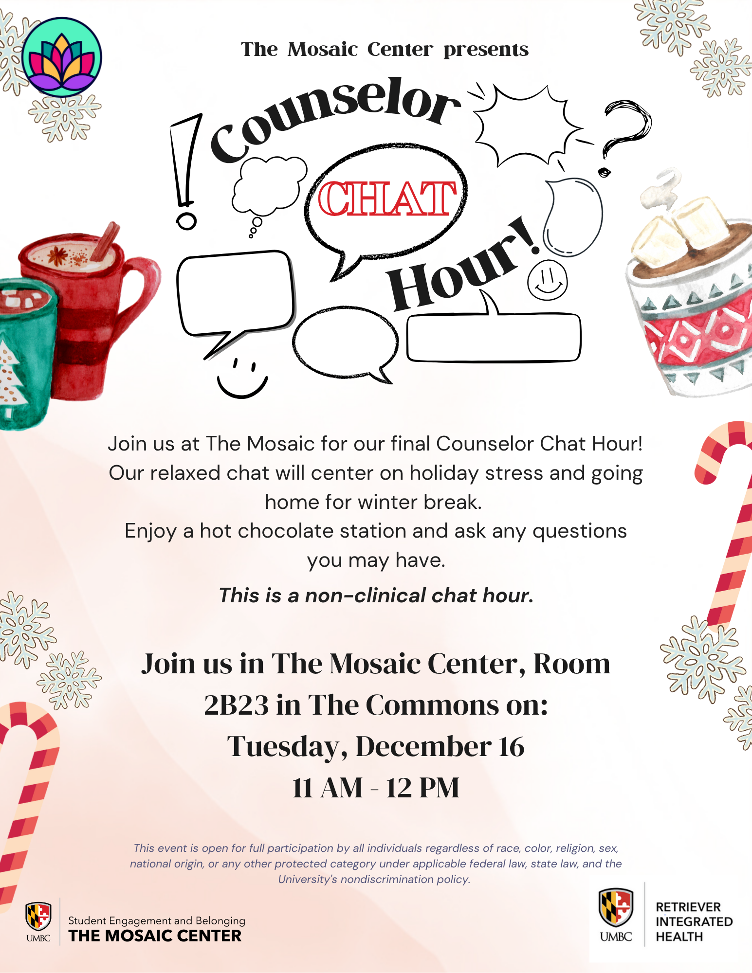 Join us in 2B23 The Commons for our last Counselor Chat of the semester!